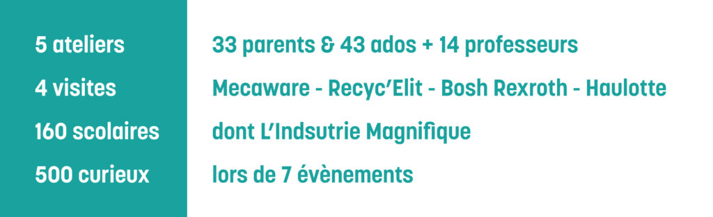 - Des ateliers orientation pour parents et adolescents, articulés autour d’une thématique métier et du témoignage d’un industriel accompagné d’un organisme de formation.